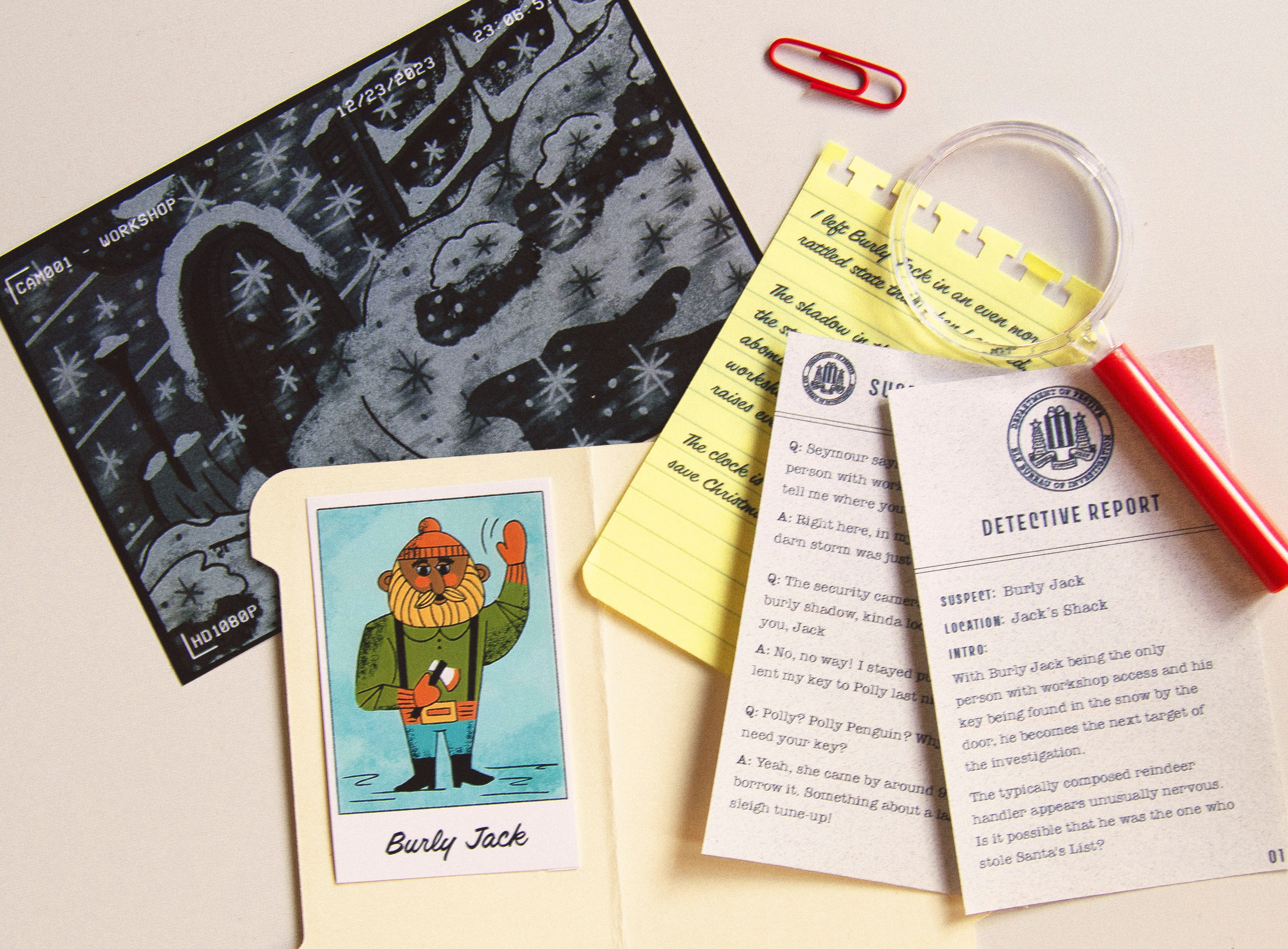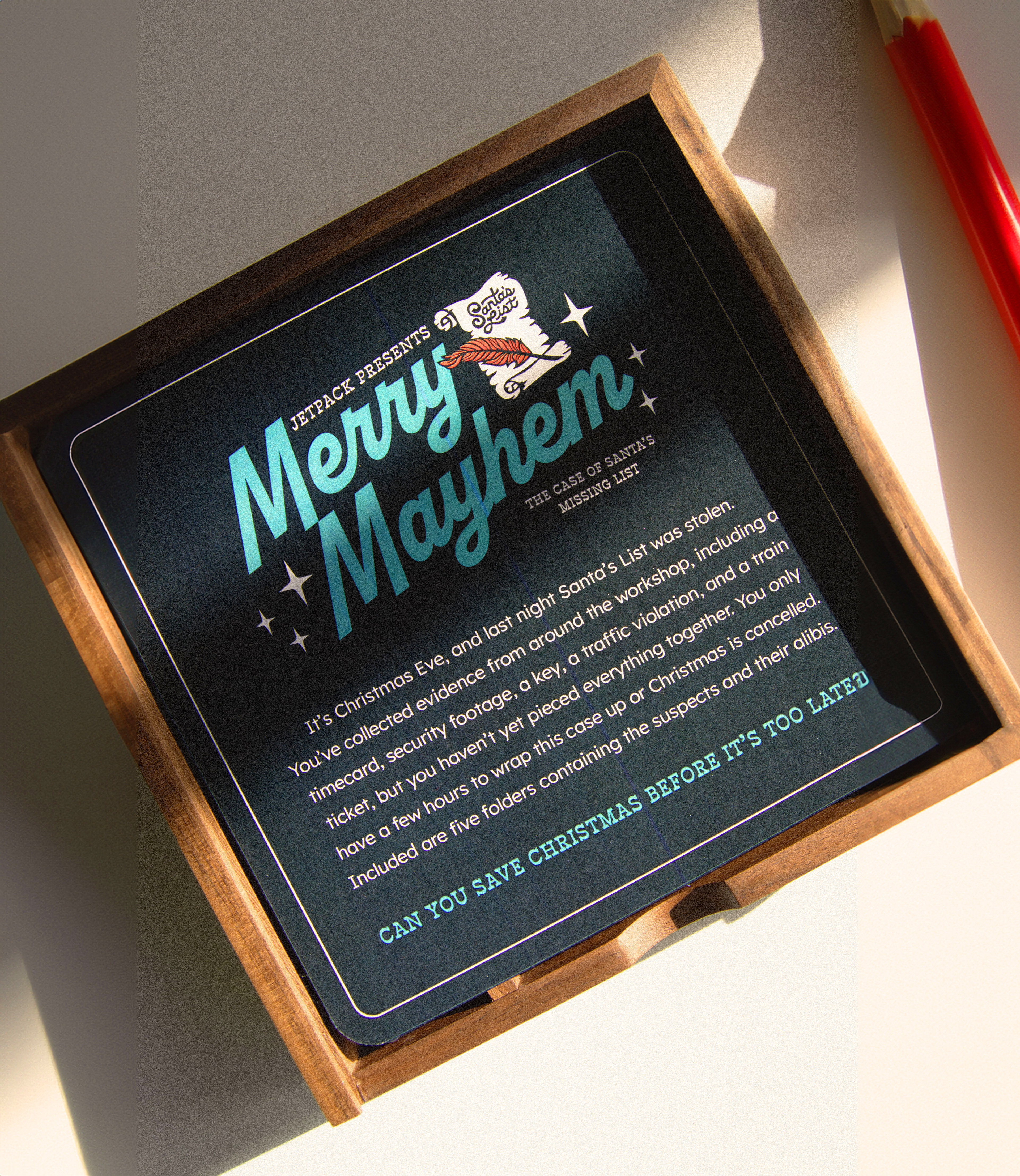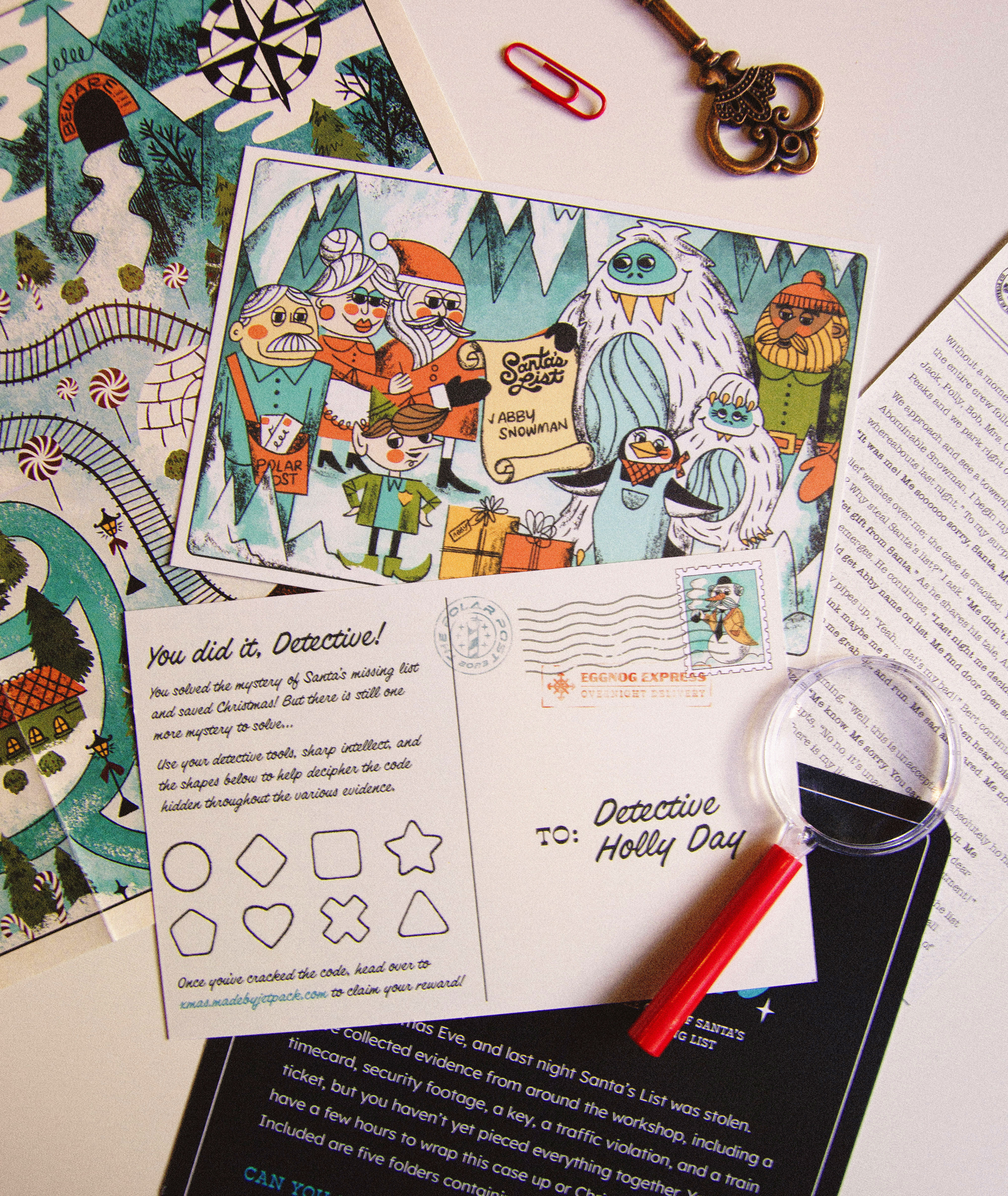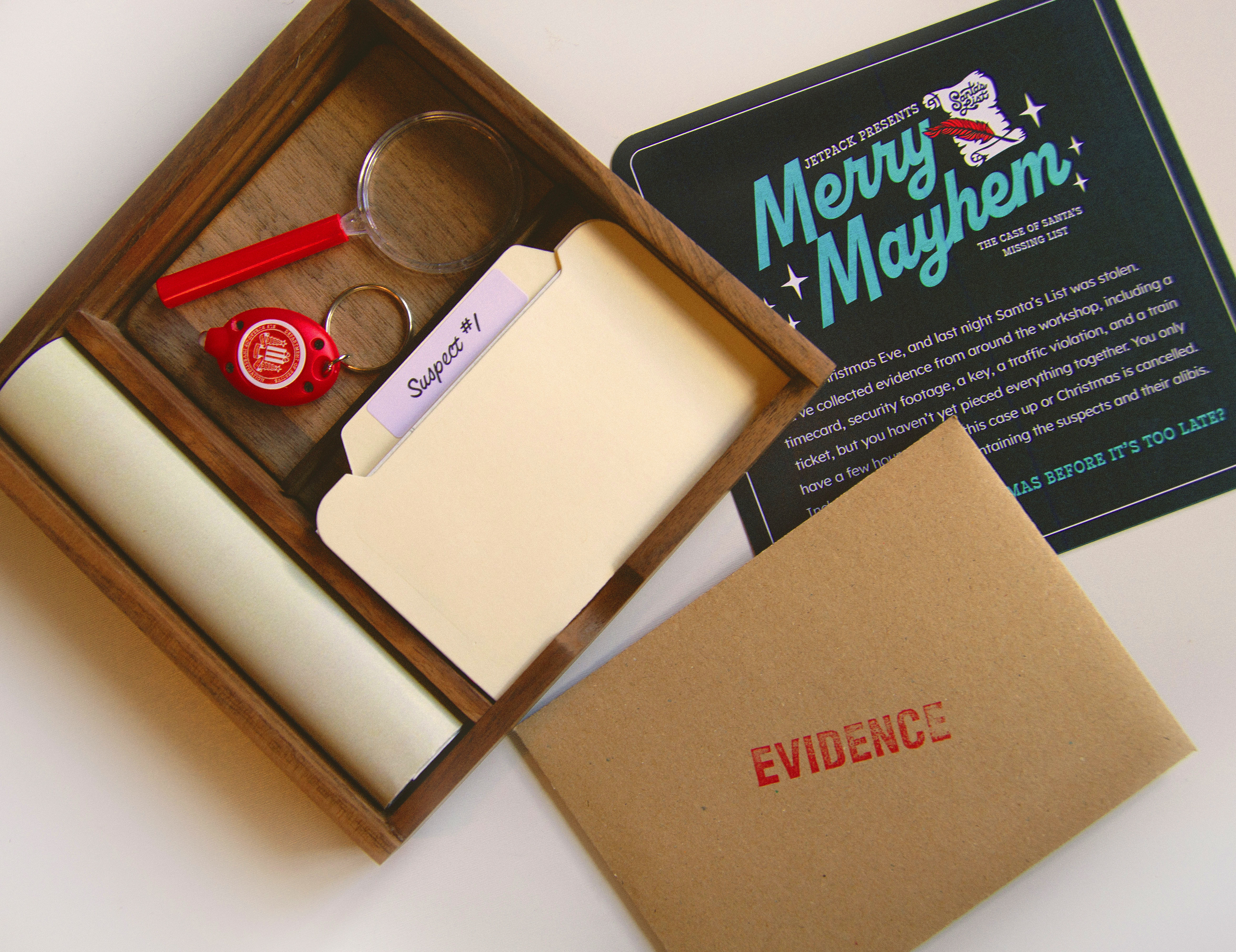 Each year at Jetpack, we celebrate the holidays by sending our clients and colleagues custom Christmas gifts designed and developed in-house. For 2023, we created the Merry Mayhem Christmas Mystery Game. Recipients would follow clues, analyze evidence, and interview suspects to discover who stole Santa's magic list.