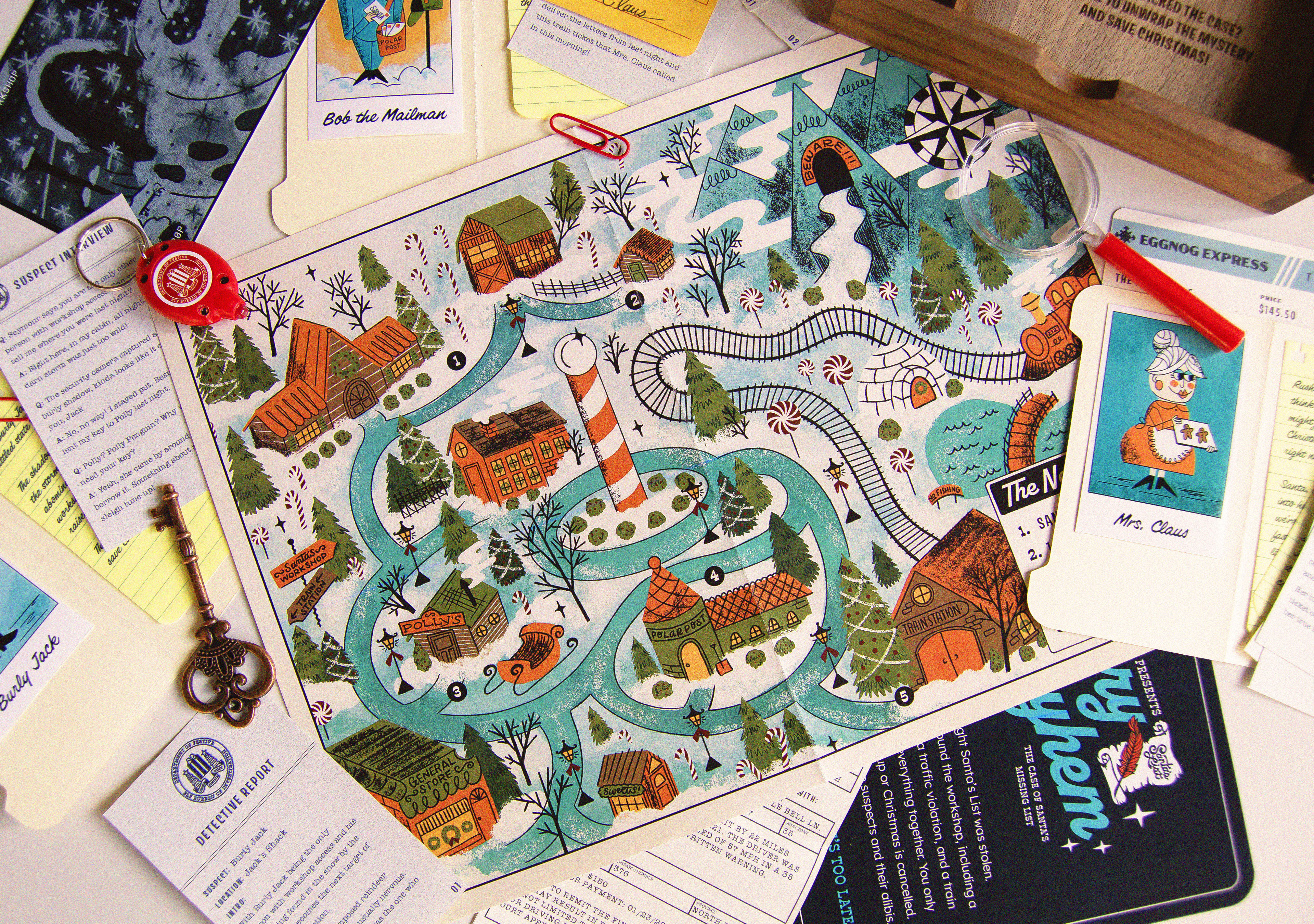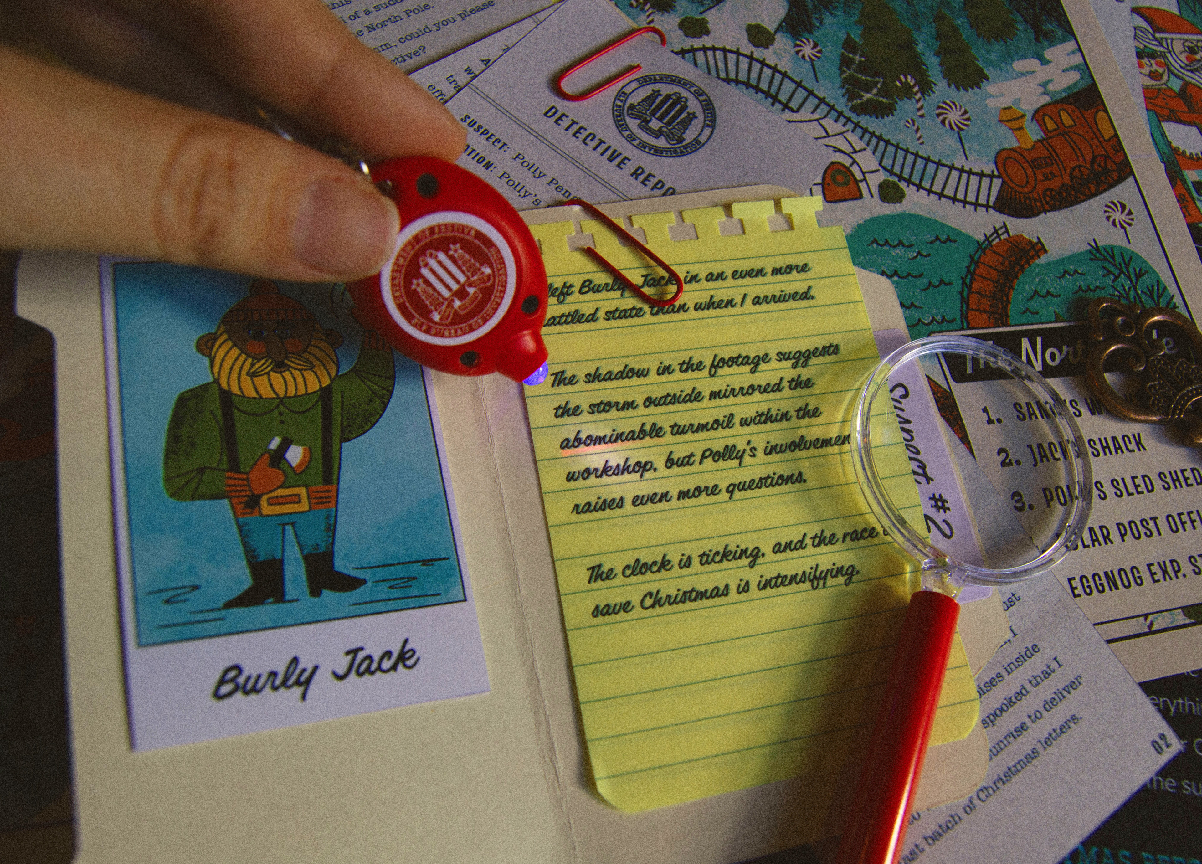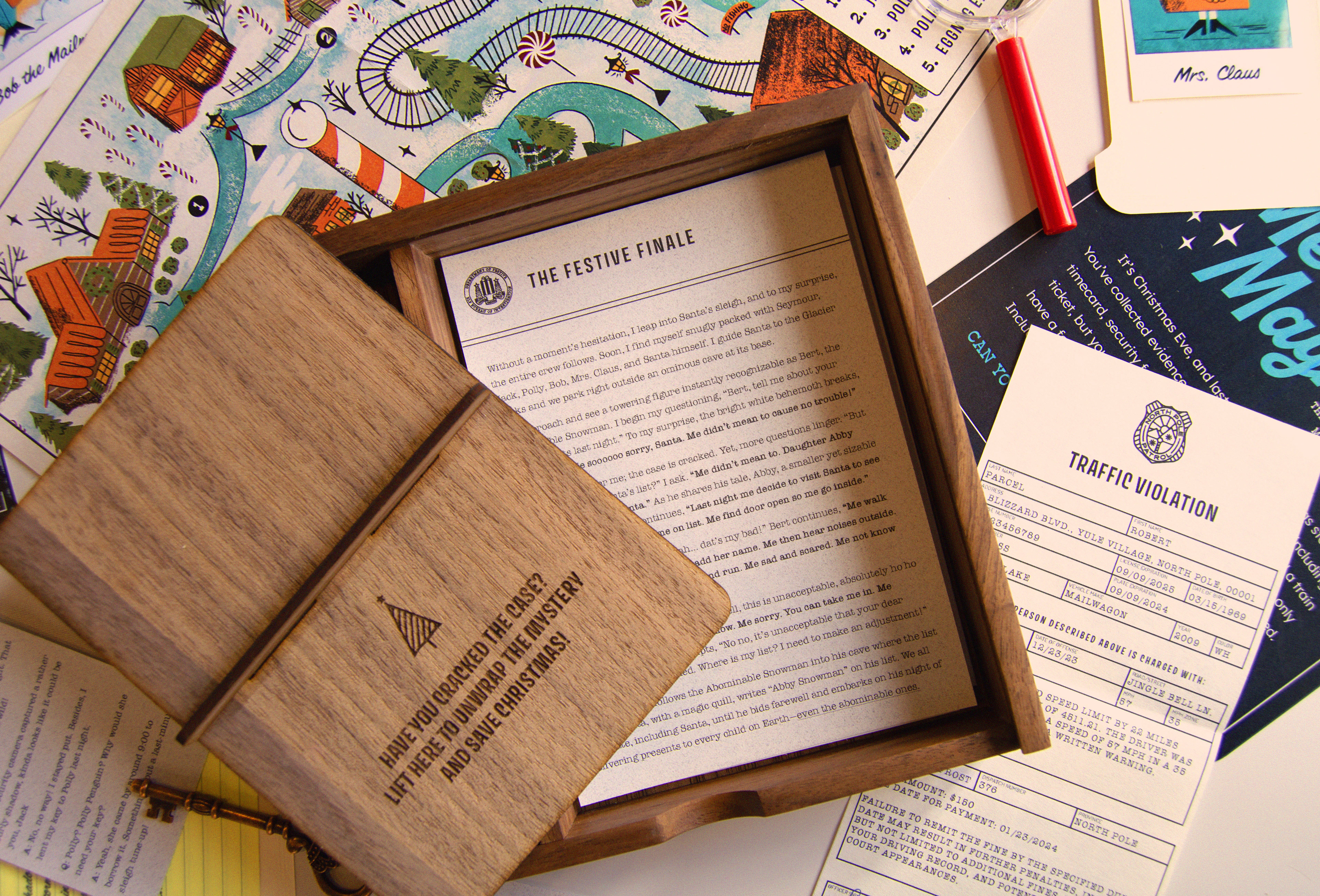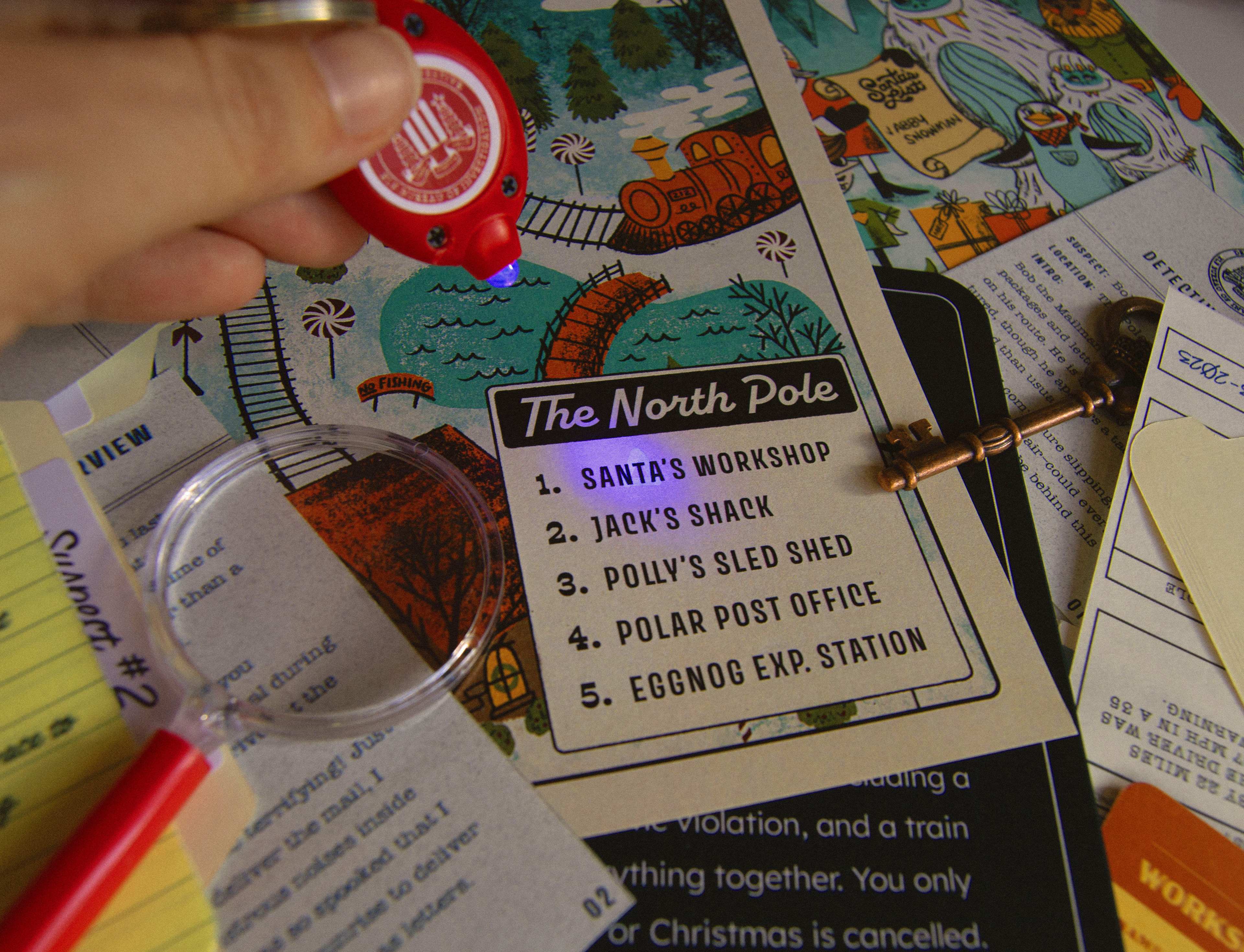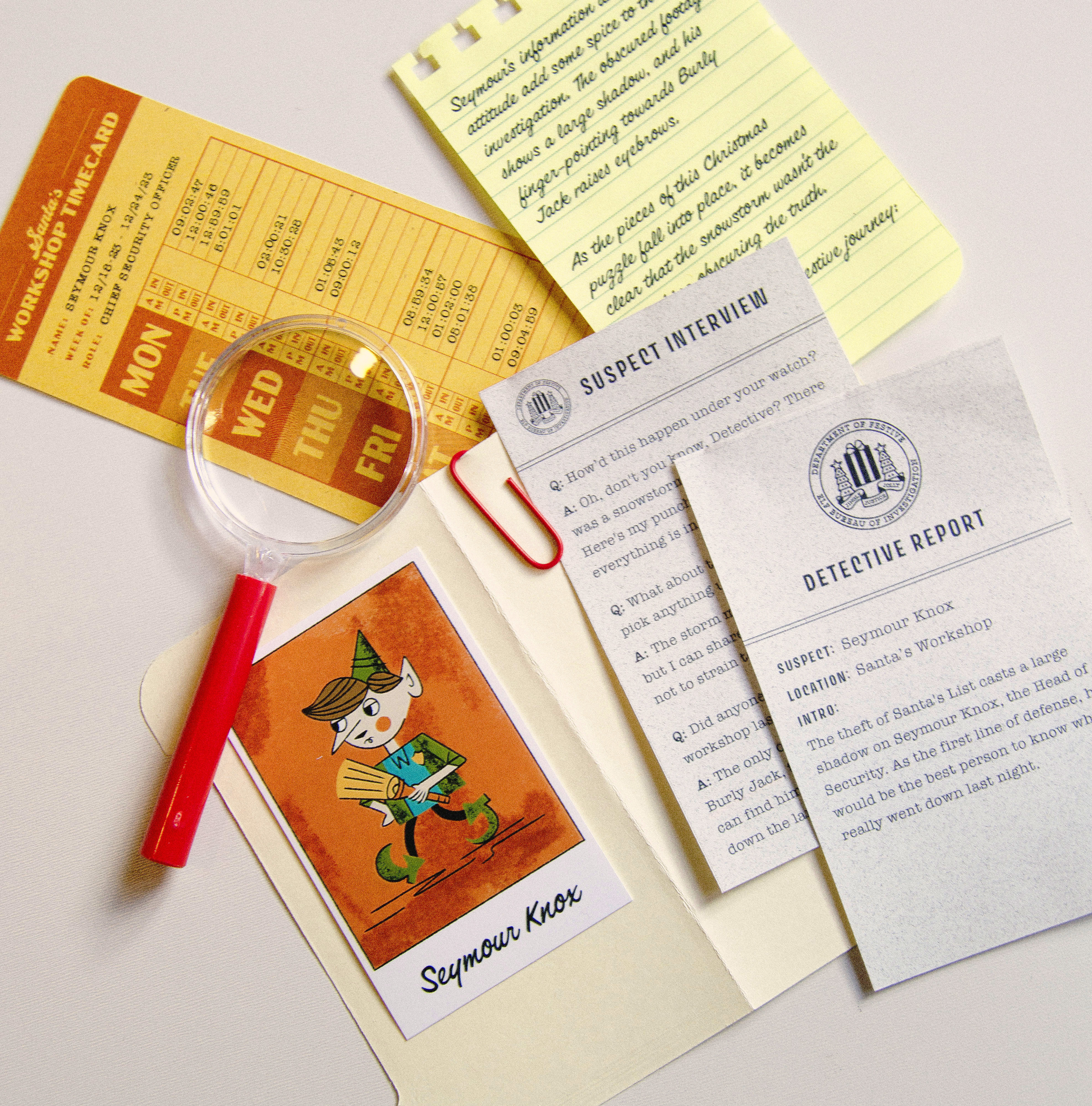 Each year at Jetpack, we celebrate the holidays by sending our clients and colleagues custom Christmas gifts designed and developed in-house. For 2023, we created the Merry Mayhem Christmas Mystery Game. Recipients would follow clues, analyze evidence, and interview suspects to discover who stole Santa's magic list.