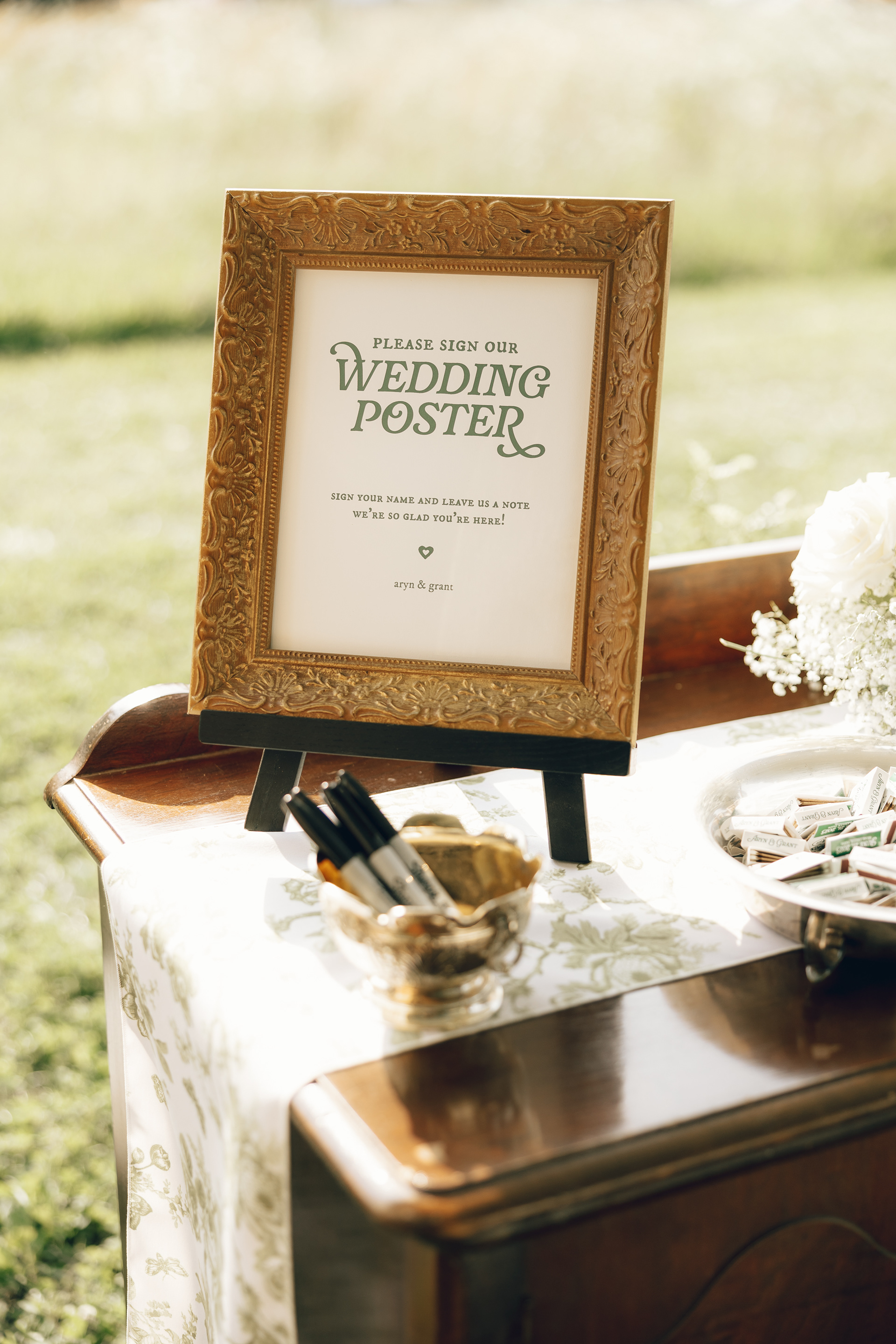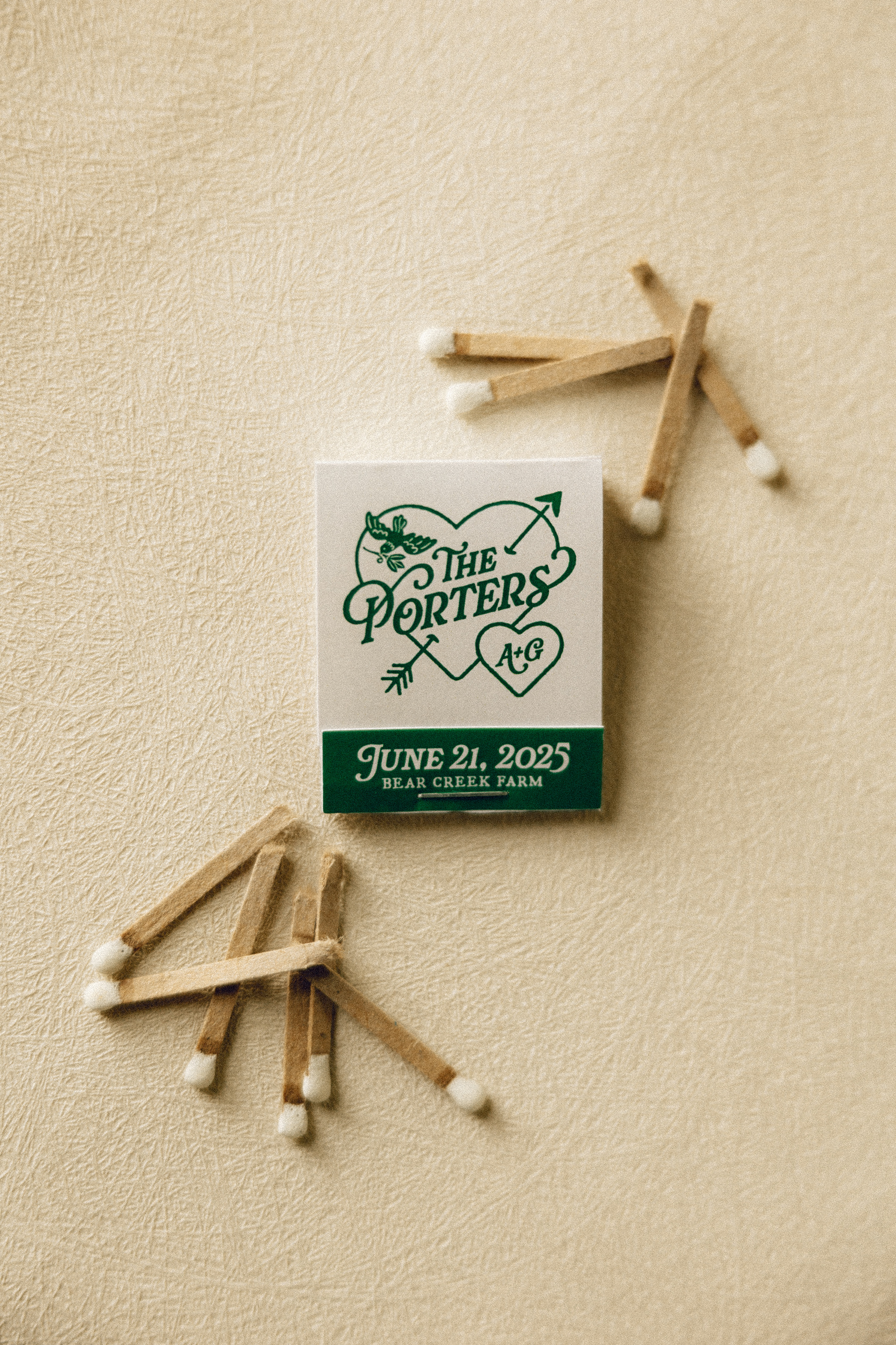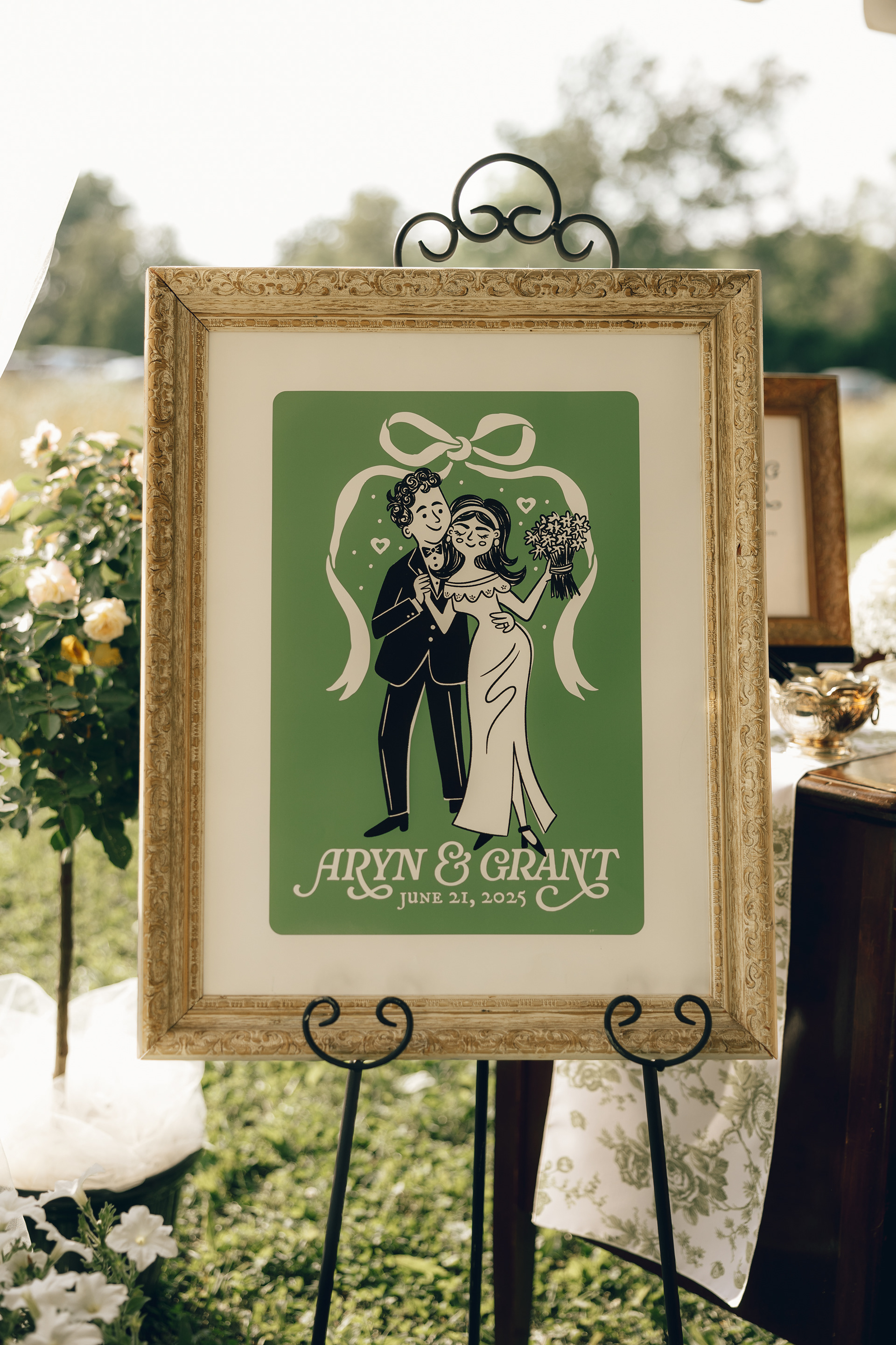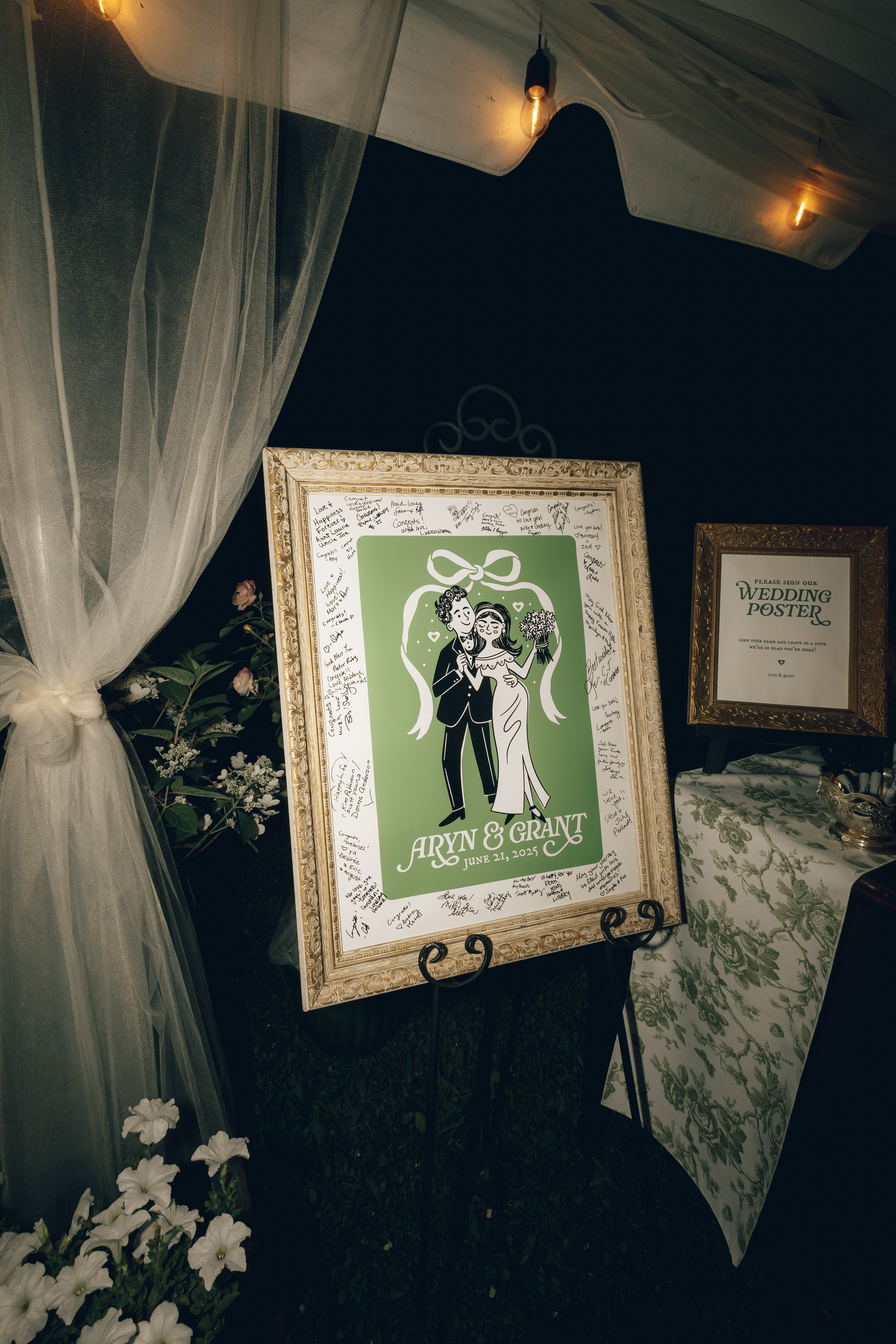 The design system extended beyond the invitation to supporting pieces, including a signed poster guestbook featuring an illustrated portrait of my husband and me, two matchbook designs, handheld fans for the ceremony, favor stickers, and various event signage.