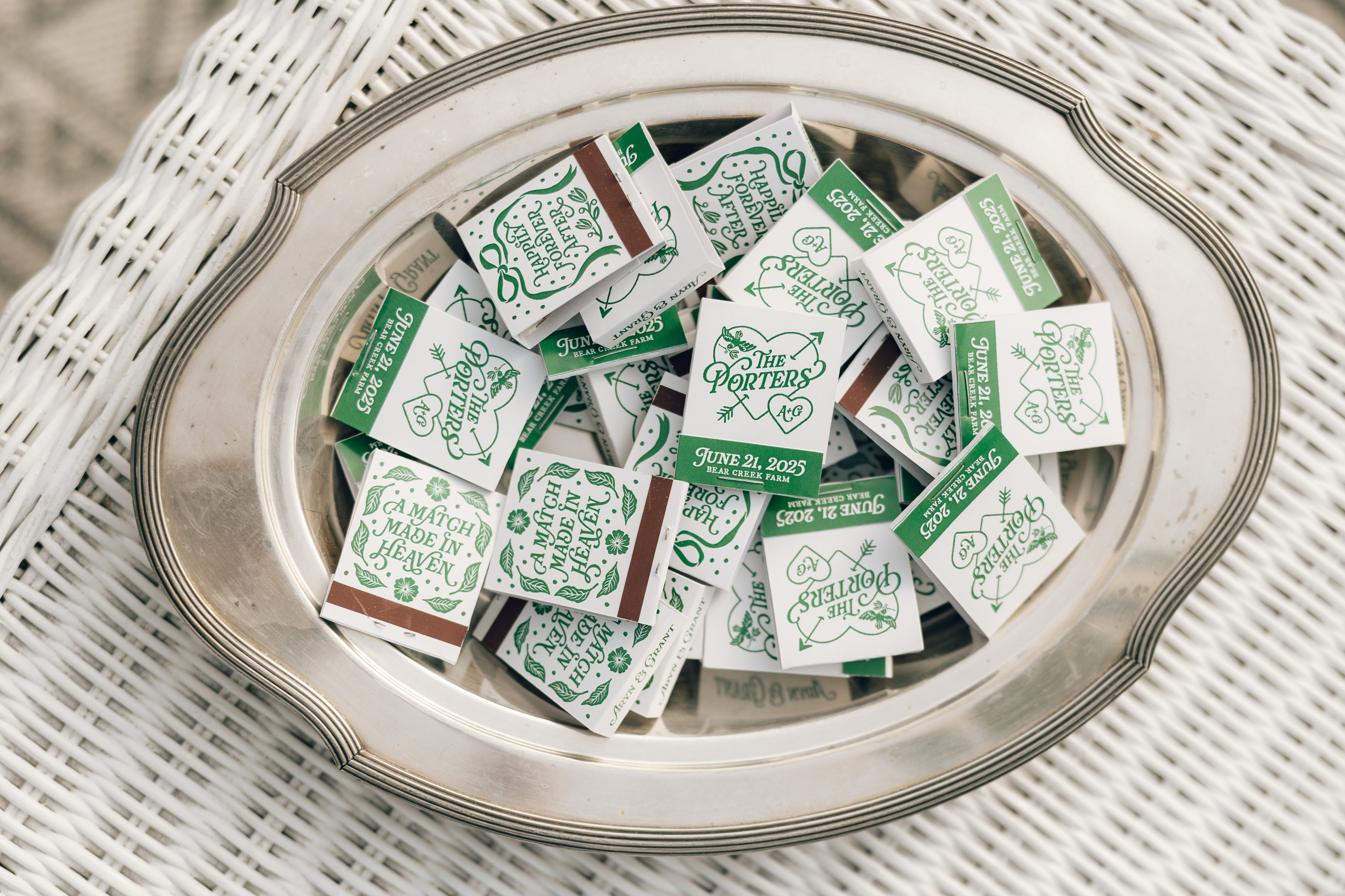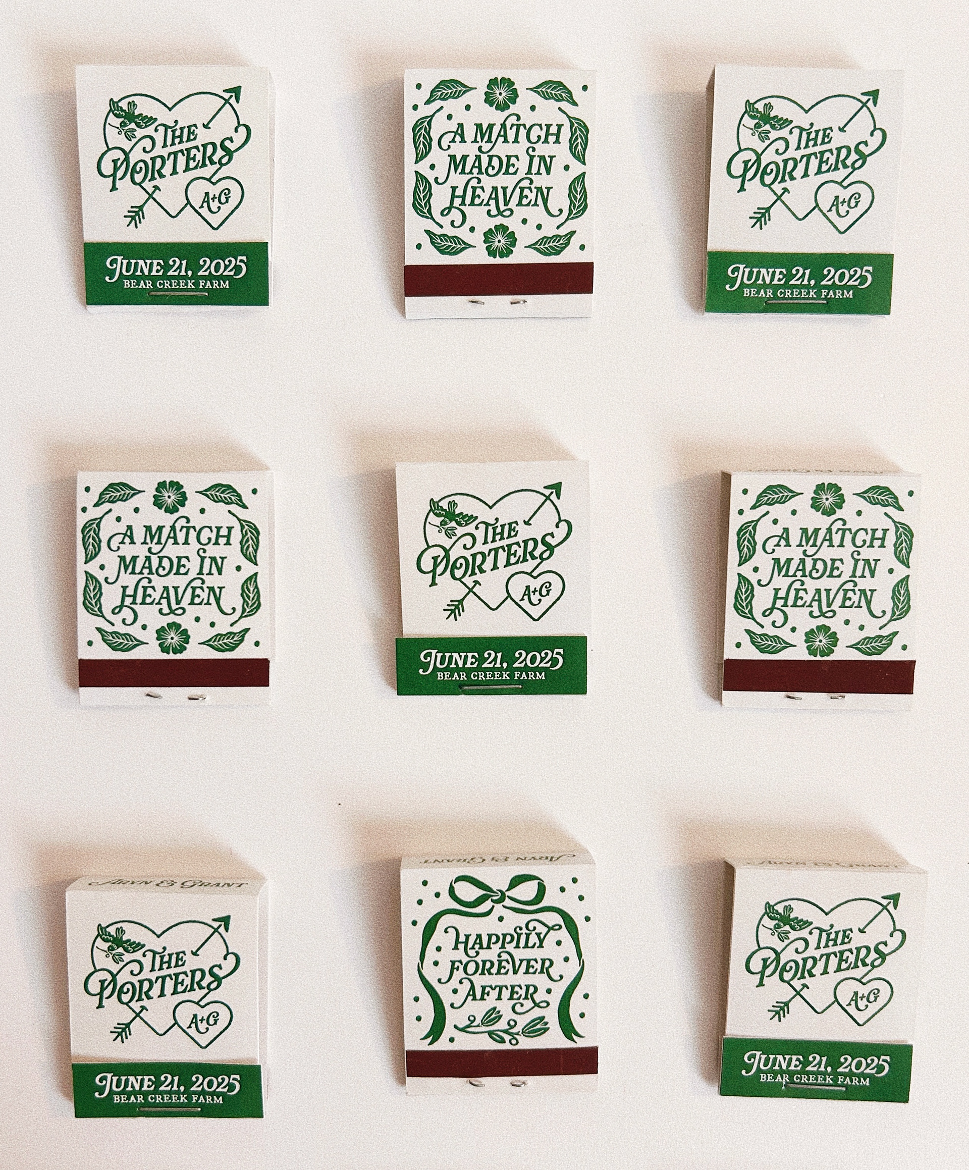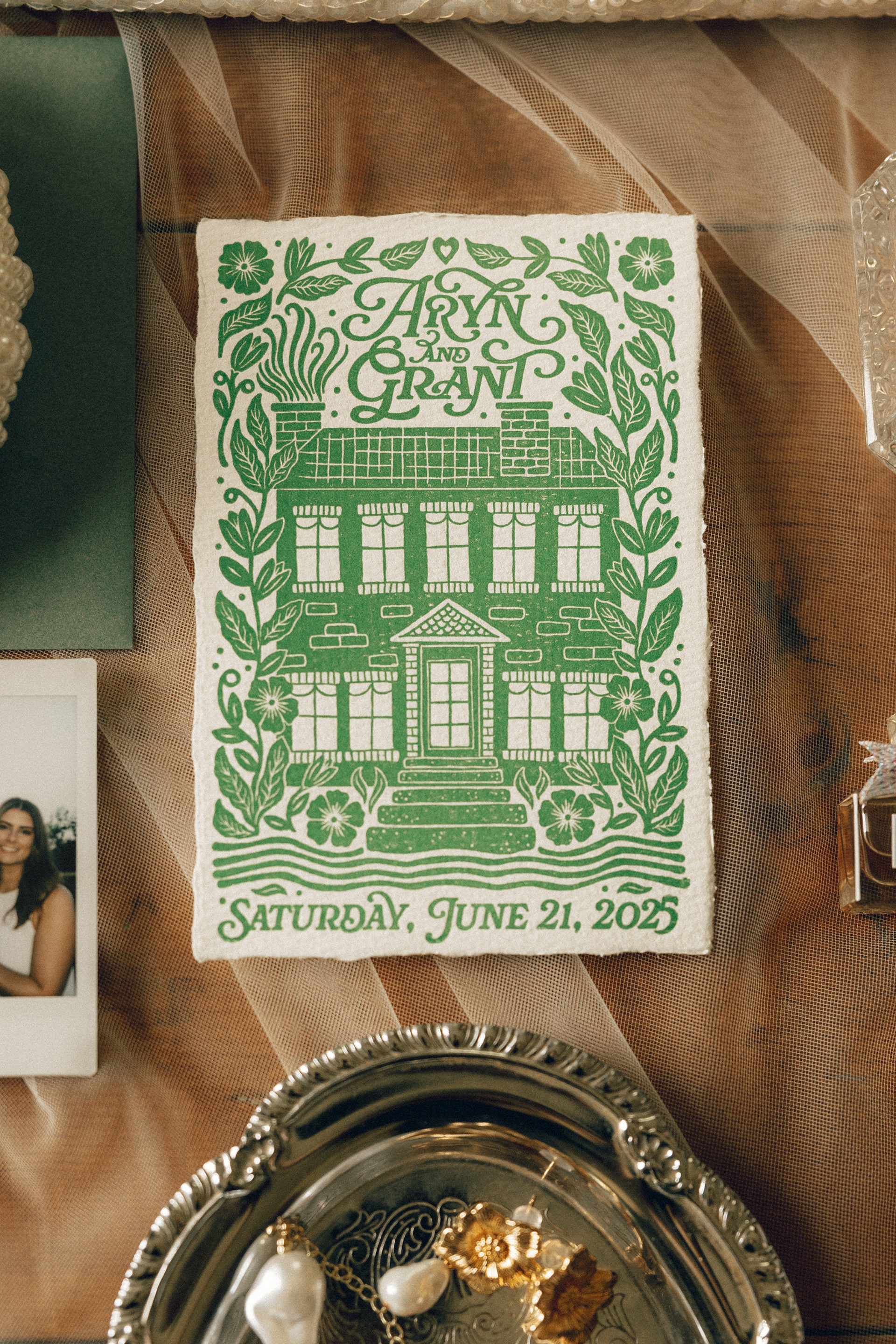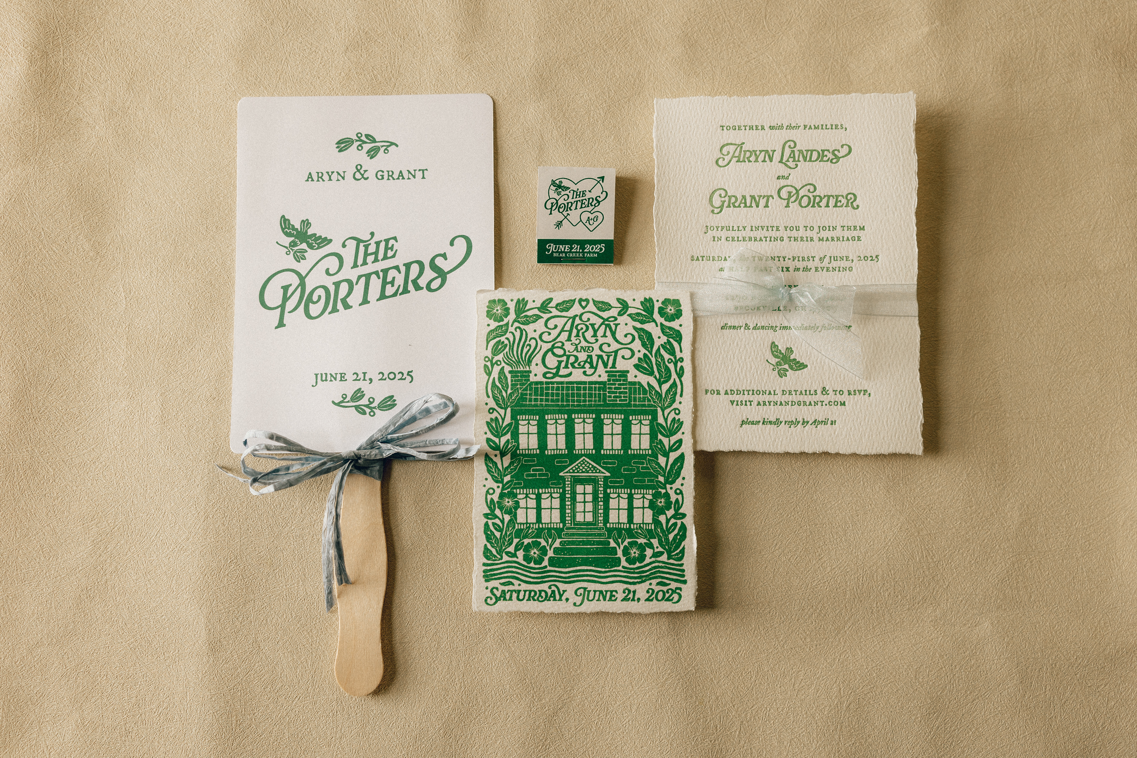 For our wedding, I designed and produced a suite of custom pieces inspired by midcentury charm and vintage garden parties. The illustration features my childhood farmhouse, which also served as the wedding venue. Each invitation was letterpressed by hand (by me!) on my kitchen table, adding a personal and handcrafted quality to each page.